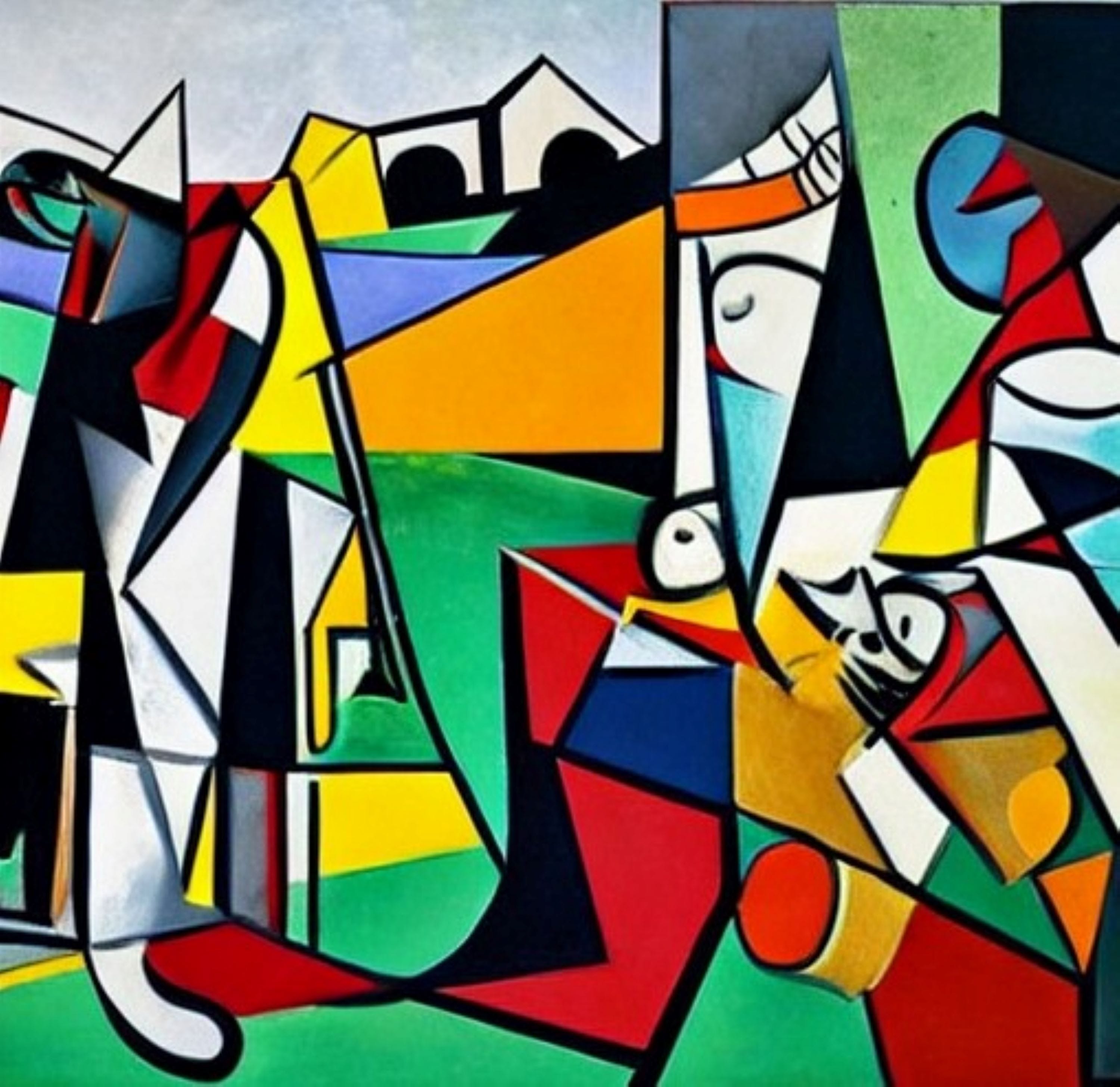 As you delve into the depths of my Cubist masterpiece, I invite you to dive into the realm of abstraction. Amidst the chaotic blend of shapes and colors, can you decipher the essence of Surrey's charm? Can you spot the rolling hills, enigmatic Dorking Cockerel standing tall, the intricate designer "charity" shops, and the whimsical tracks of the Great Cockcrow Railway? NO? Me neither…